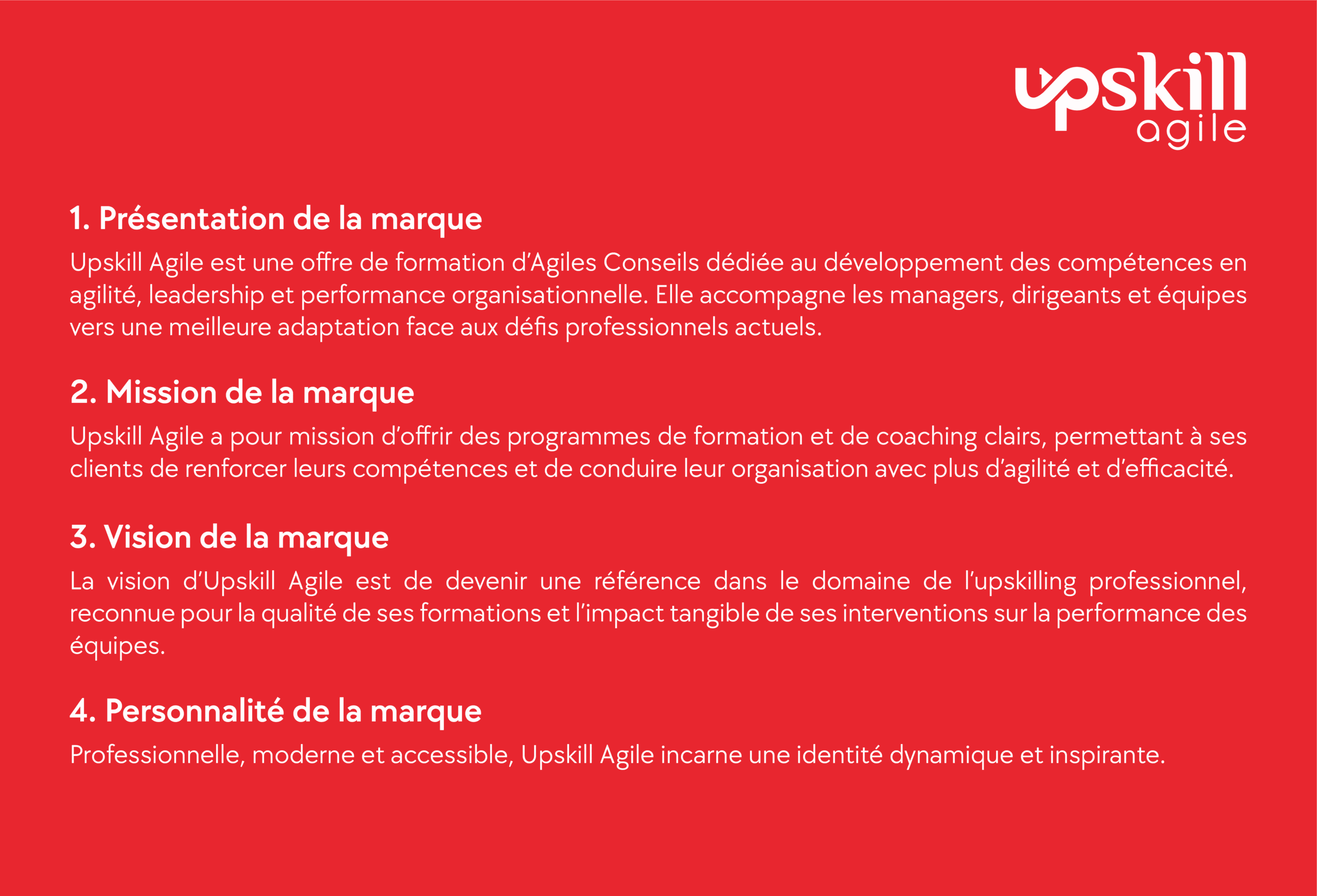 Upskill Agile a pour mission d’offrir des programmes de formation et de coaching clairs, pratiques et directement applicables, permettant à ses clients de renforcer leurs compétences et de conduire leur organisation avec plus d’agilité et d’efficacité. La vision de la marque est de devenir une référence dans le domaine de l’upskilling professionnel, reconnue pour la qualité de ses formations et l’impact tangible de ses interventions sur la performance des équipes. Professionnelle, moderne et accessible, Upskill Agile incarne une identité dynamique et inspirante, reflétant la volonté d’aider chacun à progresser et à s’adapter dans un environnement en constante évolution.