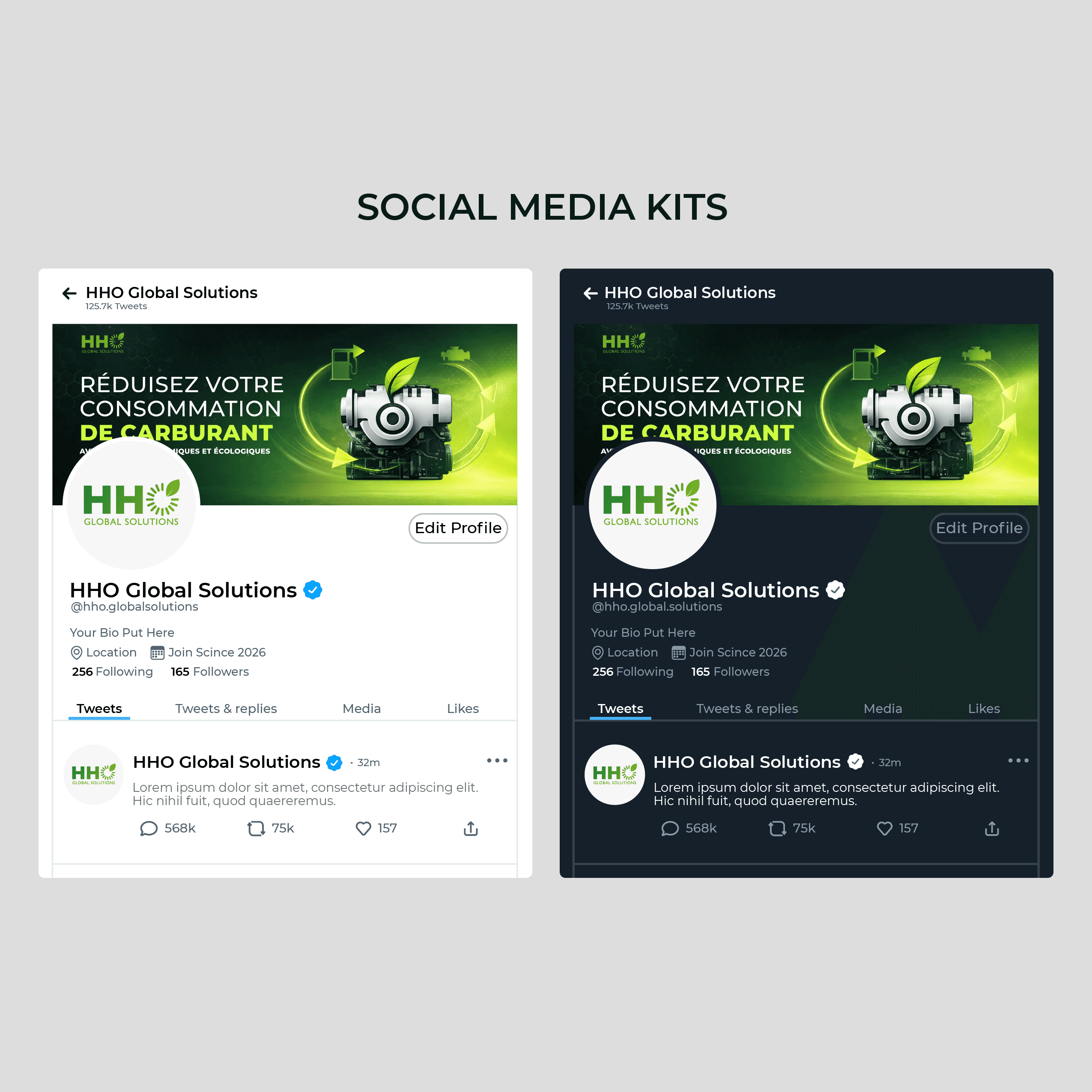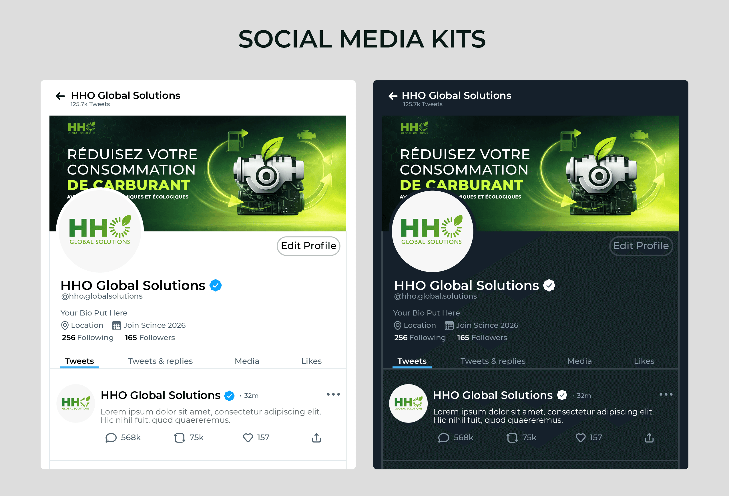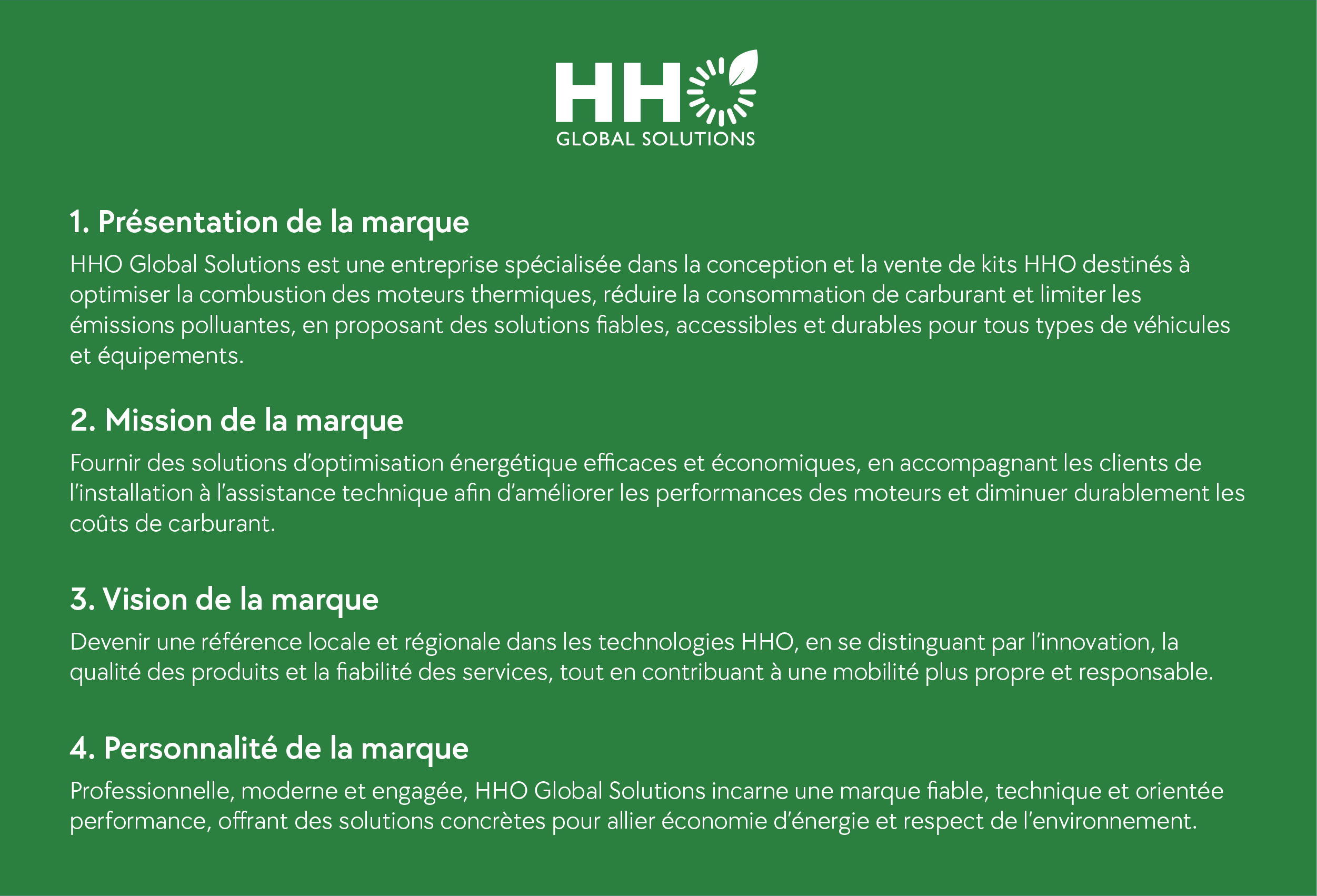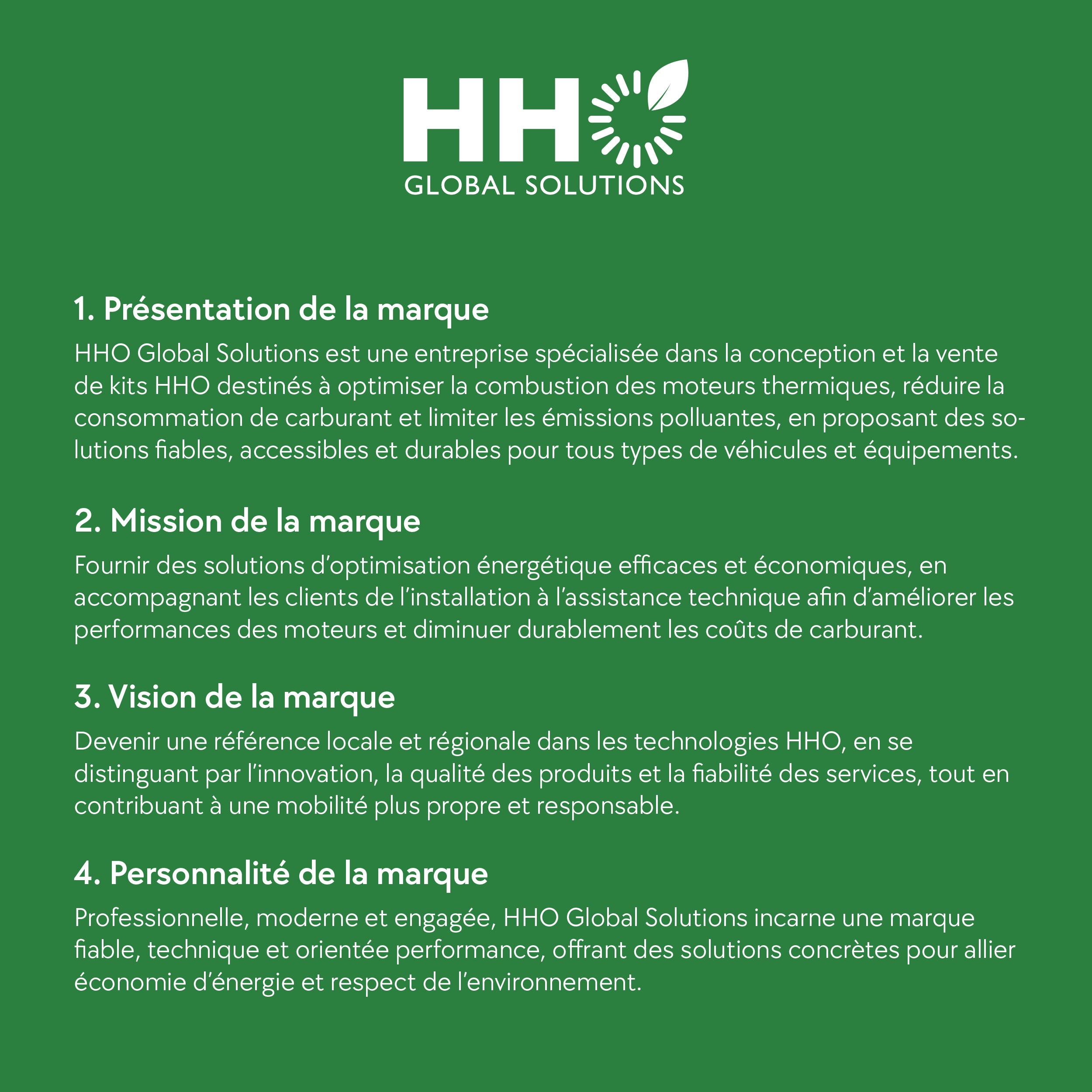 Le branding combine donc rigueur industrielle et dynamisme écologique, afin de positionner HHO Global Solutions comme une référence fiable et moderne dans son secteur.
